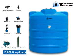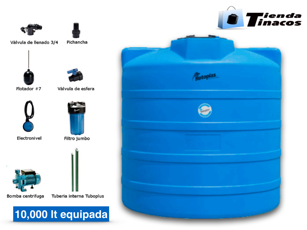 CISTERNA ROTOPLAS DE 10,000 L INCLUYE PICHANCHA, VALVULA DE ESFERA, ELECTONIVEL, FILTRO JUMBO, BOMBA DE 1/2 HP, VALVULA DE LLENADO Y FLOTADOR DEL # 7 MEDIDAS: DIAMETRO 2.38/+/-0.025 m Y ALTURA 2.43 m. tapa 0.60 m