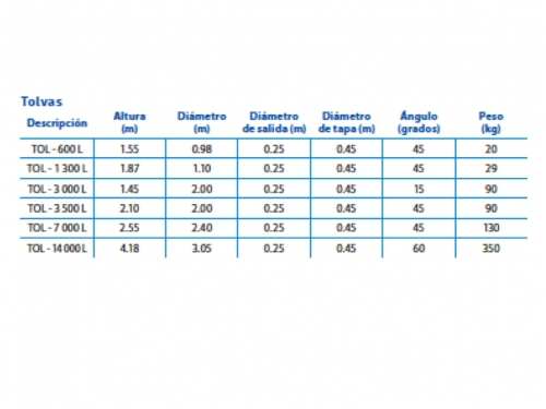 PREGUNTE POR NUESTROS TIEMPOS DE ENTREGA Y PRECIOS DE MAYOREO. EL ALMACENAMIENTO ESPECIALIZADO EN TOLVAS ES PRACTICO PARA AGUA, ALIMENTOS Y QUIMICOS, SE ADAPTA A ESTRUCTURAS DE ABASTO, CUENTAN CON FONDO CONICO DE ANGULOS DE 15º, 45º Y 60º, CONFORME A SUS NECESIDADES, MANTIENEN LA TEMPERATURA Y EVITAN FORMACION DE FAUNA NOCIVA, CUENTAN CON MATERIAL GRADUADO Y TRASLUCIDO, NO GENERA COLOR, OLOR NI SABOR, NO REQUIEREN MANTENIMIENTO, NO SE CORROEN Y PERMITEN LA DOSIFICACION Y VACIADO TOTAL DEL PRODUCTO.